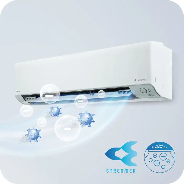 เครื่องปรับอากาศระดับพรีเมียมที่มีฟังก์ชันฟอกอากาศแบบดับเบิ้ล ด้วย Streamer Technology ประจุอิเล็กตรอนความเร็วสูงช่วยยับยั้งเชื้อโรคภายในเครื่องปรับอากาศ ประสานพลังกับ Active Plasma Ion ปล่อยประจุลบเข้าจับฝุ่น PM2.5 สารก่อภูมิแพ้ และเชื้อโรคที่อยู่ภายนอกเครื่องปรับอากาศ สะดวกสบายด้วยการควบคุมผ่านสมาร์ตโฟนและฟังก์ชันทำความสะอาดตัวเอง เย็นทันใจใน 1 นาทีด้วย Powerful mode ใหม่ เย็นสบายด้วยระบบคุมความชื้นอัตโนมัติ ประหยัดค่าไฟด้วยค่าประหยัดพลังงานเบอร์ 5 เต็ม 5 ดาว มอบประสบการคุ้ม ประหยัดไร้กังวล