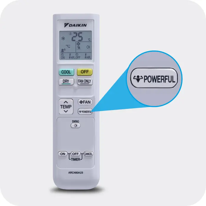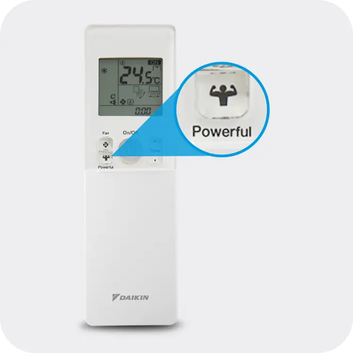 เร่งรอบการทำงานของคอมเพรสเซอร์และแรงลมสูงสุด ช่วยปรับอุณหภูมิห้องให้ลดลงรวดเร็วกว่าโหมดเย็นปกติ หลังผ่านไป 20 นาที จะกลับสู่โหมดความเย็นปกติโดย อัตโนมัติ *เวลาในการทำงานของ Powerful mode อาจะสั้นลง ขึ้นอยู่กับสภาพอุณหภูมิห้อง