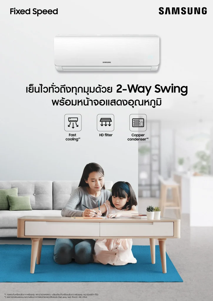 สร้างสภาพแวดล้อมที่สะดวกสบายด้วยอุณหภูมิที่เท่ากันทั่วทุกมุม ฟังก์ชัน 2-Way Auto Swing ควบคุมทิศทางลมได้โดยอัตโนมัติ เพื่อให้อากาศกระจายไปทั่วห้องได้อย่างรวดเร็วและทั่วถึง ฟังก์ชันดังกล่าวยังช่วยส่งอากาศเย็นหรืออุ่นไปได้ไกลยิ่งกว่าเดิมในทุกทิศทางเพื่อมอบความสะดวกสบายในระดับสูงสุด
